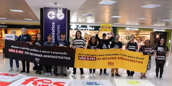 Dirigentes da APP-Sindicato e representantes dos demais sindicatos que integram o Fórum das Entidades Sindicais (FES) realizaram nesta segunda-feira (3) mais uma mobilização no aeroporto Afonso Pena contra a tramitação da Proposta de Emenda à Constituição 38/2025, a nova PEC da Reforma Administrativa.